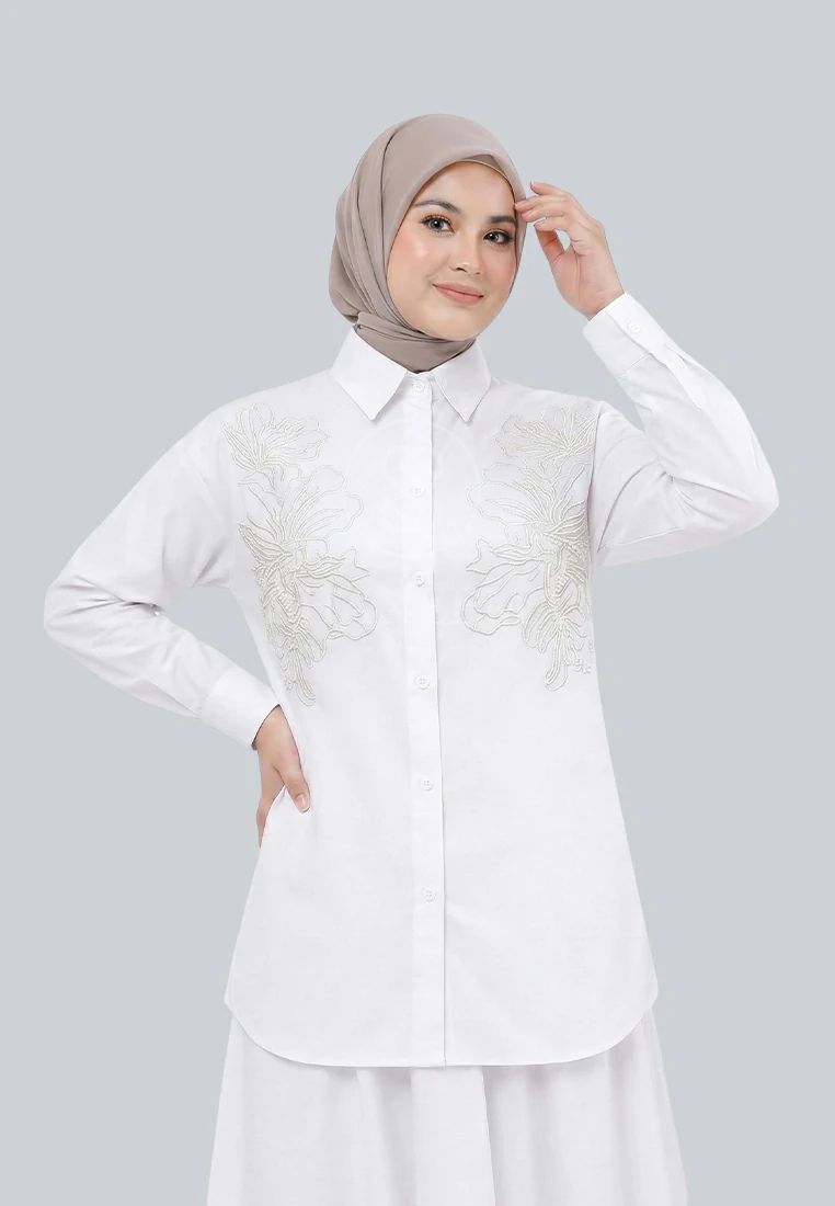Model atasan Kemeja ini, dirancang dengan model OVERSIZE, nyaman digunakan fit to XL dengan kancing depan hidup sampai bawah (breastfeeding friendly), dan desainnya yang minimalis namun tetap elegan dengan sentuhan bordir bunga yang cantik di bagian depan.